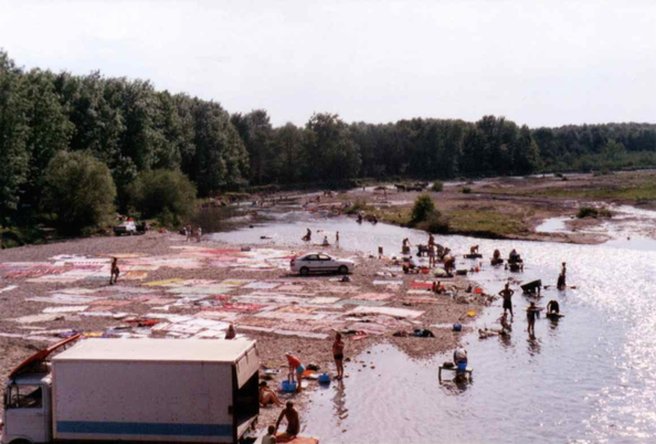 Beaucoup de silhouettes dépareillées et de tapis car les intérieurs des maisons transylvaines en sont abondamment garnis. Ils isolent, réchauffent et décorent. Ces gens des fleuves et rivières nous offrent-là leur intimité en quelque sorte, qu’ils dévoilent annuellement par nécessité d’usage dans un grand moment de lessivage avec des gestes nés en d’autres temps. Et à l’occasion, de bains de soleil, de langueur enjouée ou d’escapades aquatiques. L’étendu du vivant au ras du sol. Attachant. Vu du pont, c’était très beau, comme des damiers colorés – même si mes photos en témoignent guère.