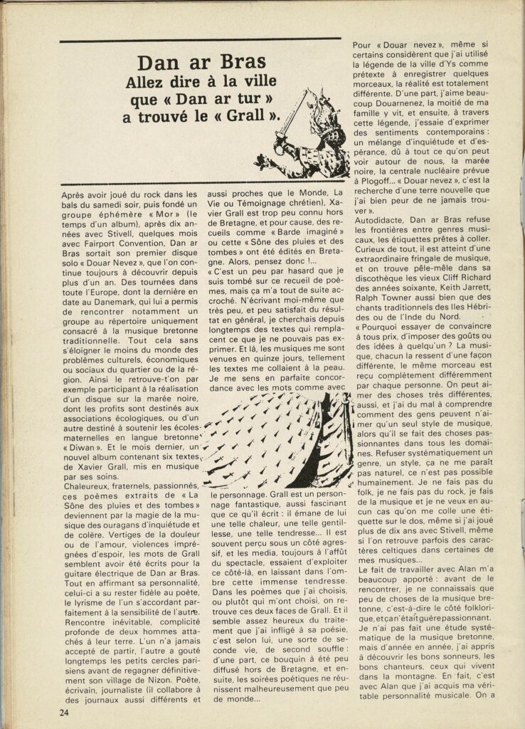 On pourrait la formuler ainsi : spécial voisinage ! Pas de doute, ce jour La Chronique d’ici-même en ce monde de plomb, dans le théâtre de la brutalité débridée, désamorce les tensions ou les risques d’affrontement. Ce rôle est essentiel. Mais pour en arriver là, il m’aura fallu passé par hasard par une phase exploratoire de la page Fb de Marie-Aline Lagadic pour, sur le tard, prendre connaissance de l’article qui tirait le portrait de Dan ar Bras, musicien et chanteur breton, signé de notre voisin combourgeois Rémy Le Tallec et paru dans L’Escargot folk de novembre 1978.